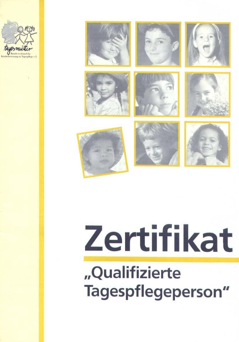Entsprechend den gesetzlichen Bestimmungen habe ich mich nach der Qualifizierungs – und Prüfungsordnung für Tagespflegepersonen vom 01.01.2004, nach den Richtlinien des Tagesmutter Bundesverbandes, auf die verantwortungsvolle Aufgabe einer Tagesmutter vorbereiten lassen und am 15.02.2005 das Zertifikat "Qualifizierte Tagespflegeperson" erhalten. Seit dem bereitet es mir enorme Freude den kleinen Persönlichkeiten in ihren ersten 3 Jahren zur Seite zu stehen.
